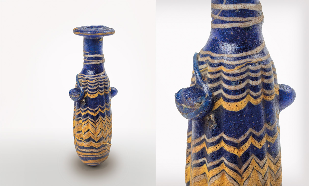 Ce vase à parfums, appelé alabastre, mesure 9,5 cm de haut et 3,4 cm de large. Conçu avec une pâte de verre entre le 2e et le 1er siècle avant J.-C., il a été mis au jour en Méditerranée orientale.