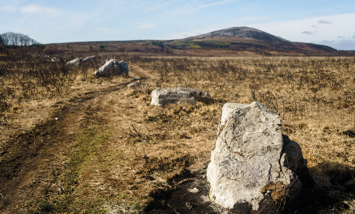 Au pied du mont Saint-Michel de Brasparts, les menhirs de La noce de pierre s'alignent sur la lande brûlée par les incendies de l'été 2022.