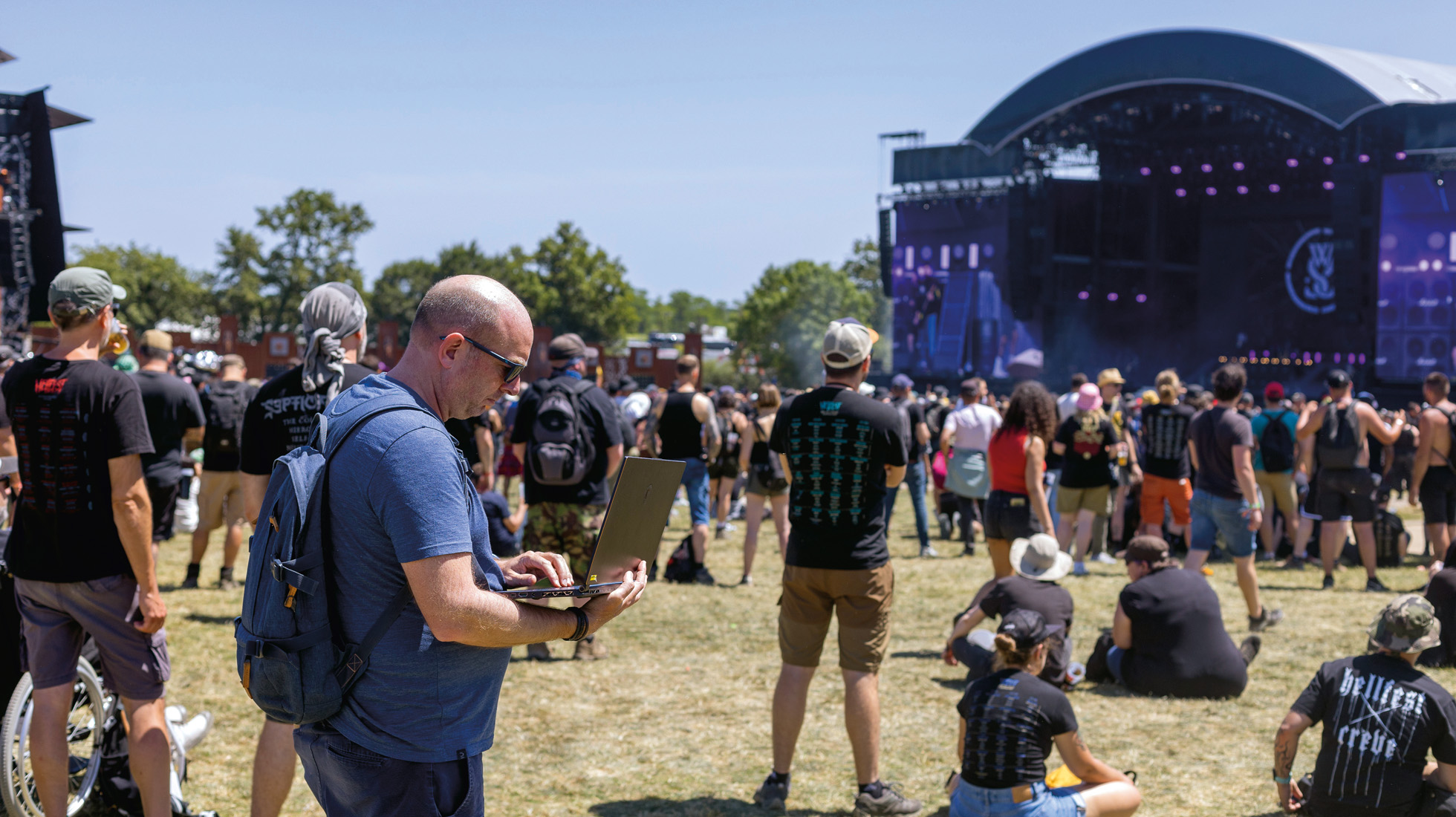 Des milliers de voitures s’étalent à perte de vue au beau milieu du vignoble nantais. Le parking s’agrandit de minute en minute tandis qu’au loin, un chapelet de bus défile sans interruption. Les véhicules se remplissent à vitesse grand V. À l’intérieur, les corps se pressent les uns contre les autres. C’est à se demander si les portes fermeront. « En physique, la foule est comparée à un milieu granulaire : elle occupe un volume différent si elle est tassée, comme du café moulu dans une boîte », nous expliquera-t-on plus tard. La navette finit par démarrer, direction le Hellfest. Fin juin, pendant quatre jours, 280 000 personnes (festivaliers, techniciens, bénévoles…) se rejoignent dans ce temple du métal, à Clisson, en Loire-Atlantique.