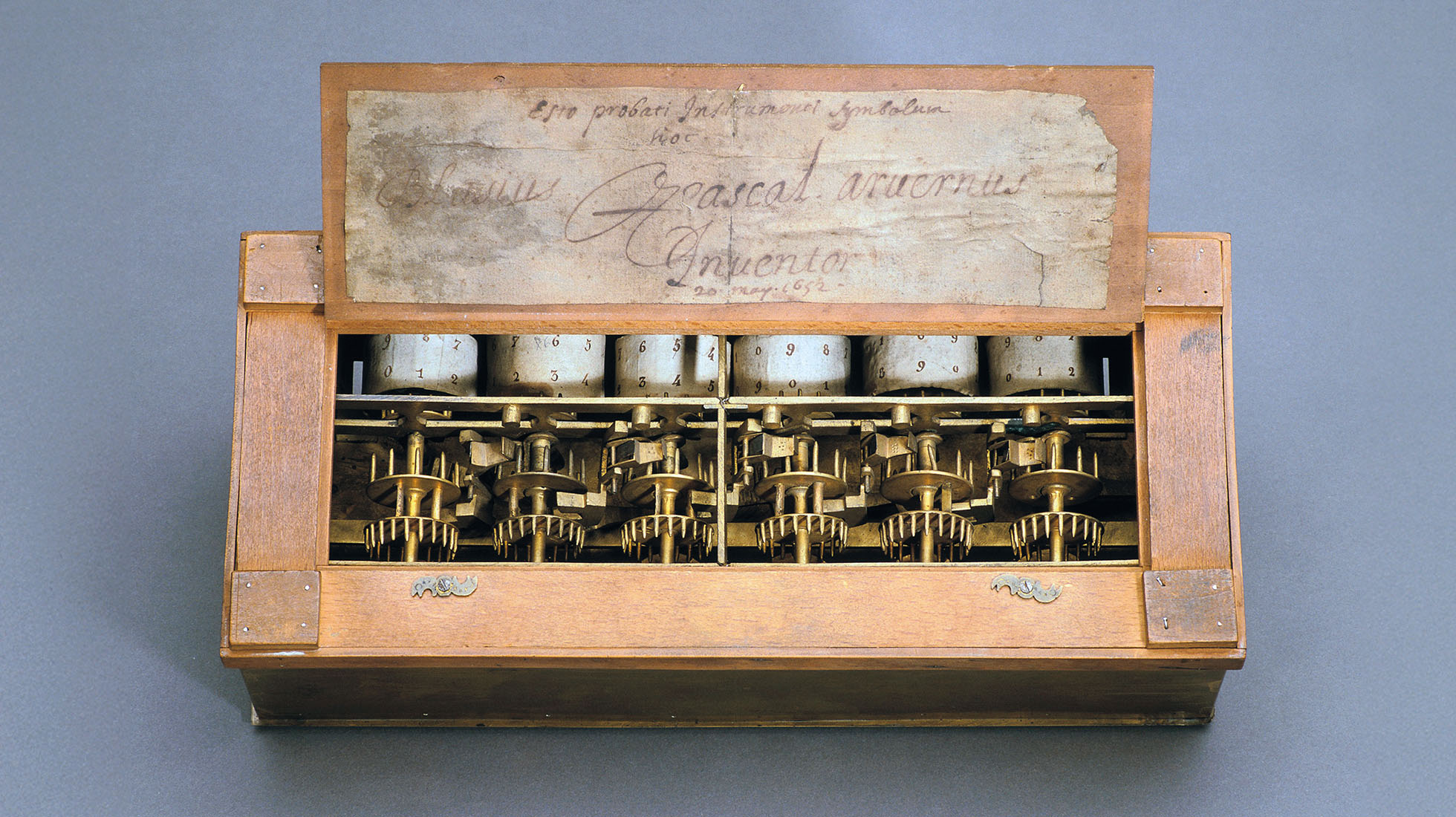 Inventée par Blaise Pascale, la pascaline est une calculatrice mécanique considérée comme la première machine à calculer. Pièce présentée au musée des Arts et Métiers, 60 rue Réaumur, Paris. arts-et-metiers.net