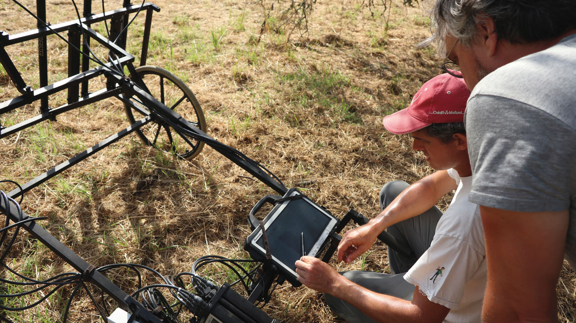 L’an dernier, l’équipe a mis en évidence les traces d’un tumulus, des trous de poteaux, des menhirs enterrés et des foyers à pierres chauffées3. Le tout sans creuser une seule tranchée, « grâce à des techniques non invasives », souligne le chercheur en jetant un regard vers Vivien Mathé, qui quadrille toujours le terrain derrière le chariot grâce auquel un à deux hectares sont cartographiés chaque jour pendant une semaine.
