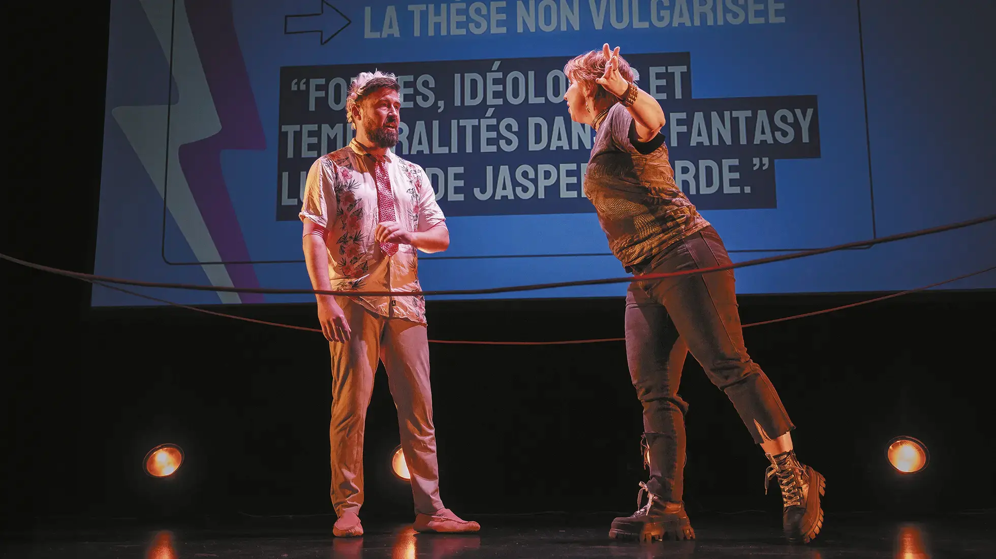Les formats d’improvisation proposés permettent de jouer avec les sciences : protocole scientifique, vocabulaire spécifique ou encore sujet de thèse non vulgarisé, comme « Formes, idéologies et temporalités dans la fantasy ludique de Jasper Fforde ». Une thématique qui n’a pas manqué d’inspirer les improvisateurs. « Les comédiens ont joué le décalage sur ce genre littéraire en incarnant des mages et des sorcières, ça m’a fait rire ! Il y a néanmoins bon nombre d’autres formes de fantasy », précise le doctorant. Si les moments d’improvisation sont présents pour détendre l’atmosphère, ils sont à chaque fois remis dans le contexte scientifique puis expliqués par le chercheur. « J’ai adoré une scène où une comédienne jouait une conférencière évitant des questions trop complexes. C’est une bonne satire du monde académique que Jasper Fforde ne supporte pas ! », s’amuse Stanislas Derrien. Un quiz interactif avec le public permet à chaque fin de session de faire le bilan des sujets abordés.