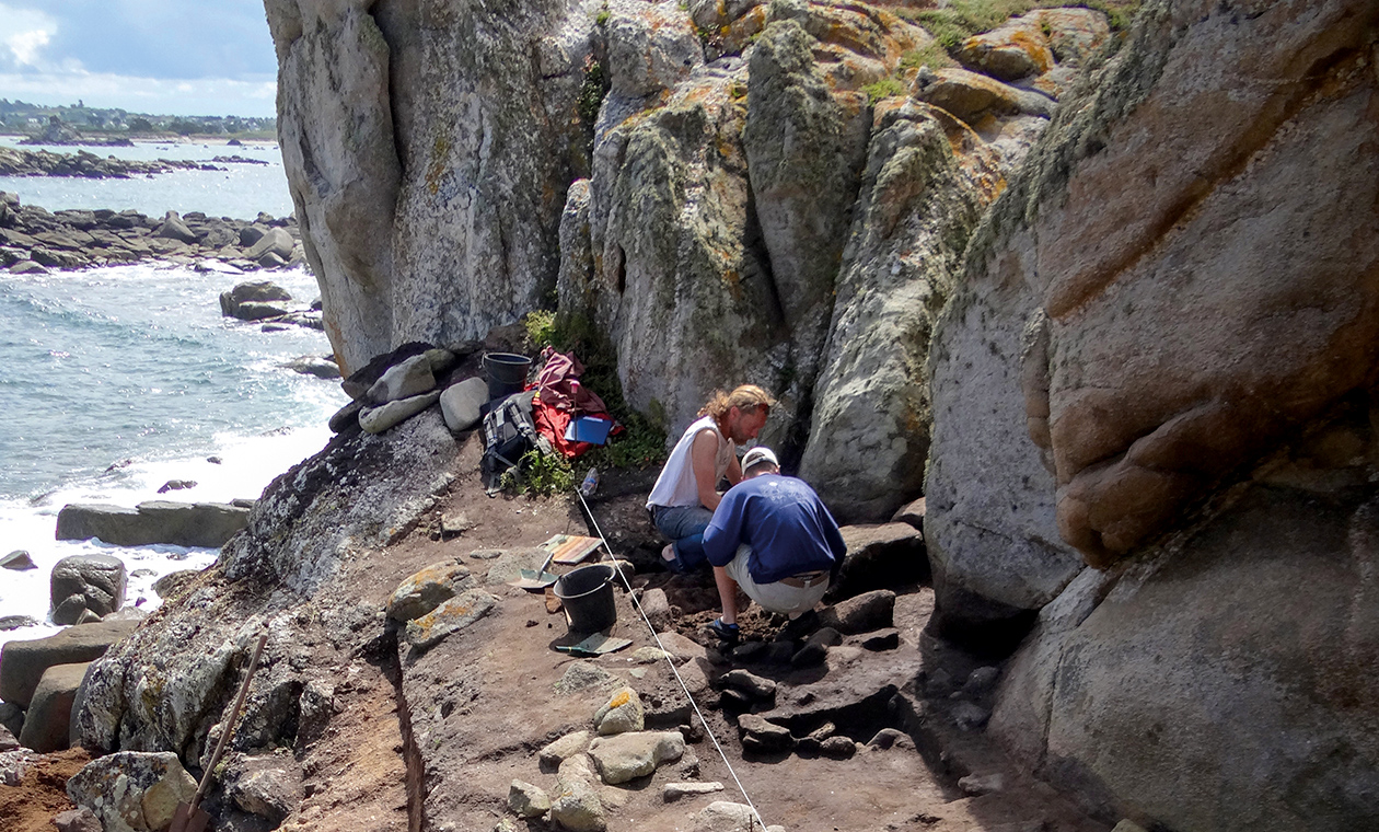 Fouilles sur l'îlot de Roc'h Santeg Leton, à Santec (Finistère). Il a été occupé du paléolithique moyen à l'âge du Fer.