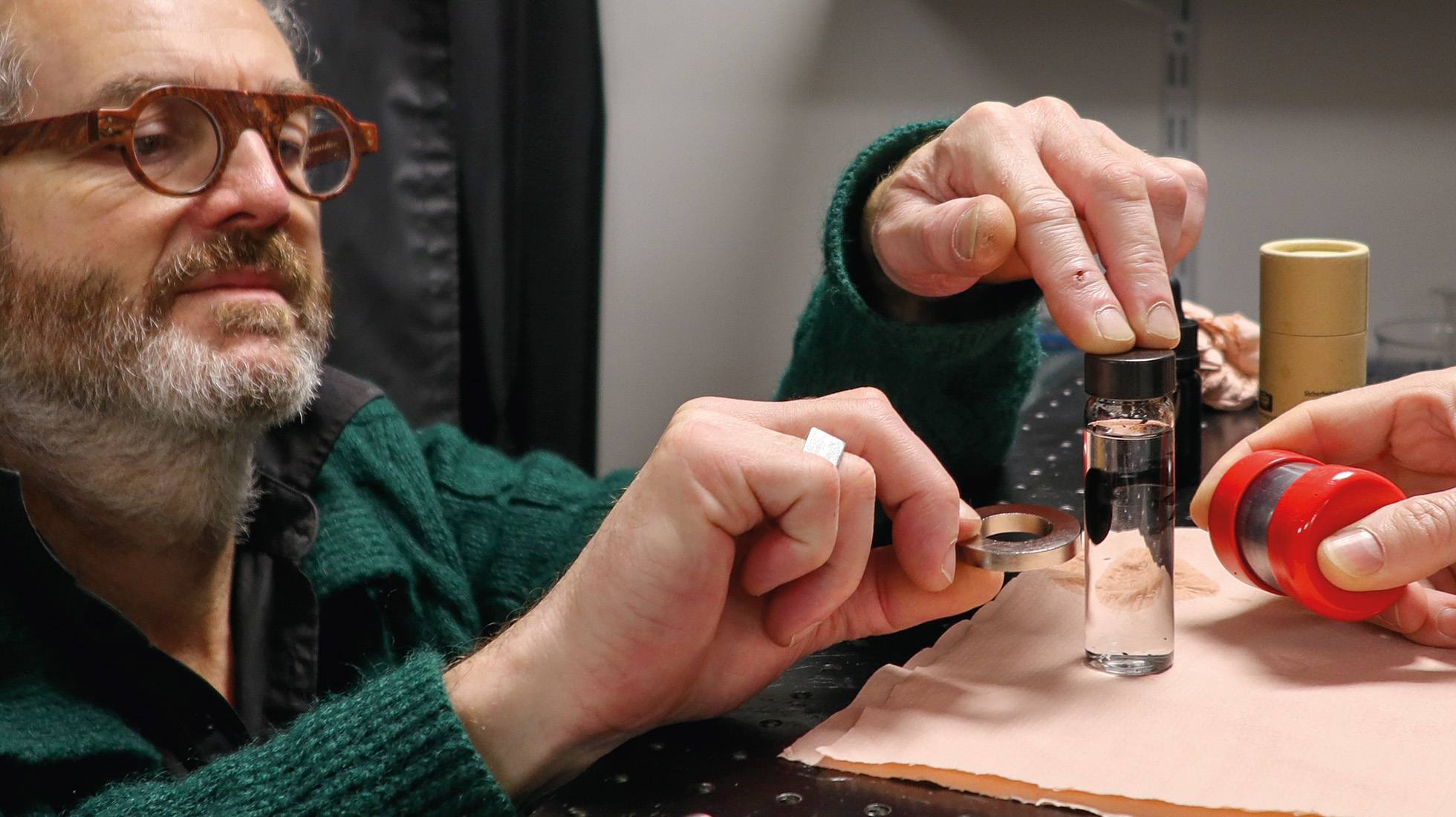 Dans le laboratoire presque désert, Fred et Flavien s’installent autour d’une table. Joris leur a laissé des tubes et des billes. « Il faut d’abord mettre le liquide ou les billes selon toi ? » Ils tâtonnent, glissent des billes translucides dans de petits tubes qu’ils remplissent d’une eau saturée en sel et ajoutent le ferrofluide, visqueux et très noir. L’eau salée est censée empêcher le fluide de se dissoudre et de s’accrocher au verre. Les deux artistes promènent un aimant autour du liquide et le fluide suit l’impulsion magnétique. « Très décevant, ça colle aux billes », souffle Fred.